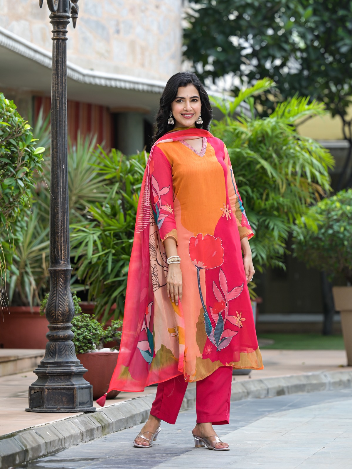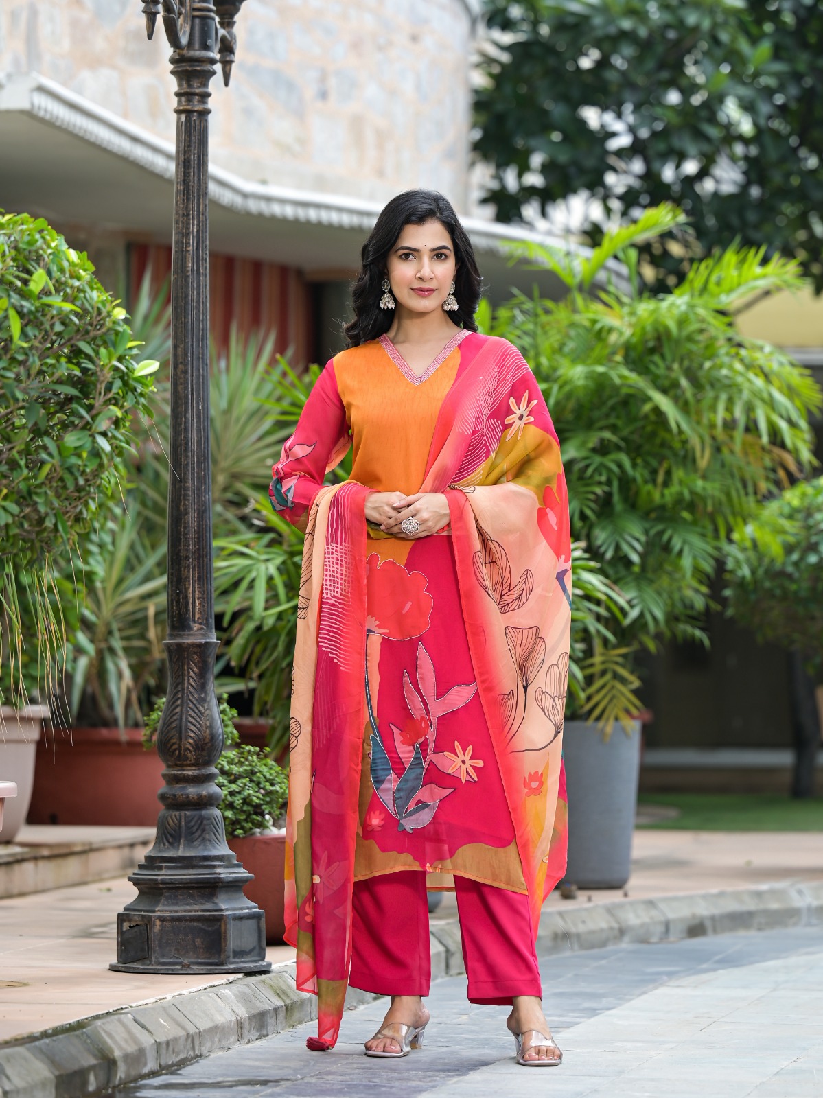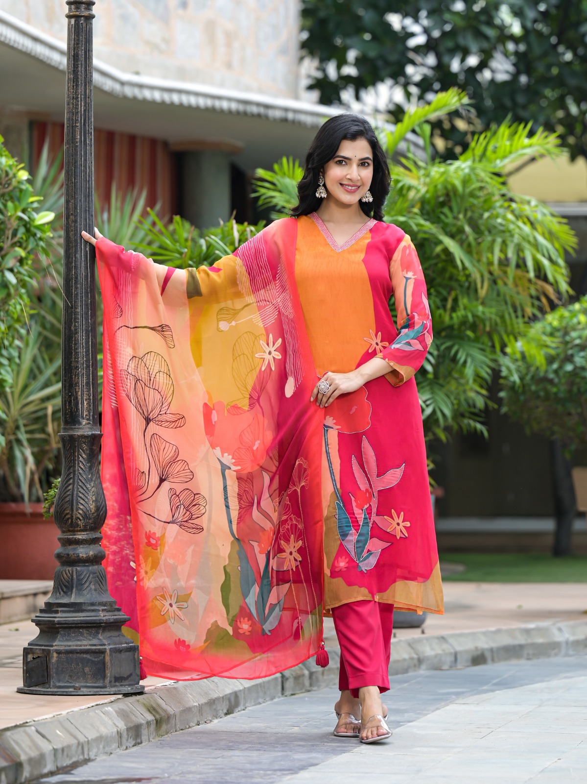 Design: Bold floral prints with a breezy dupatta