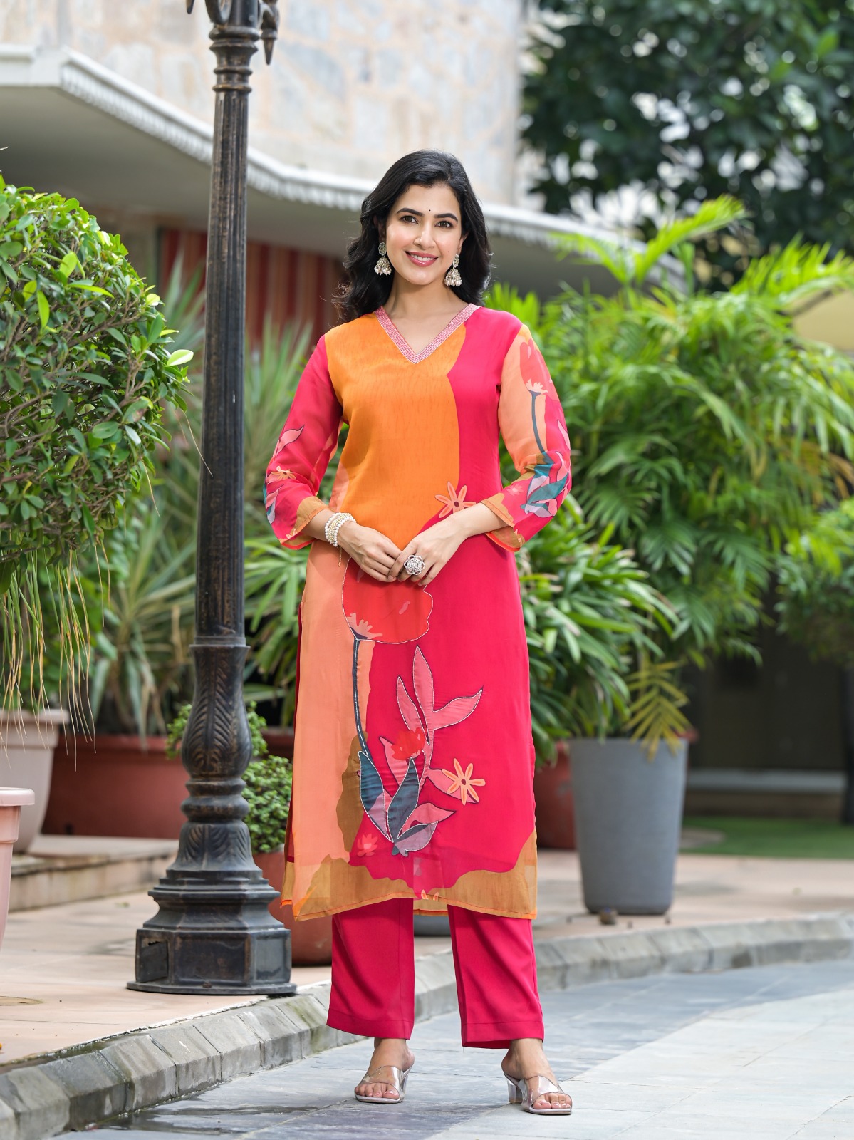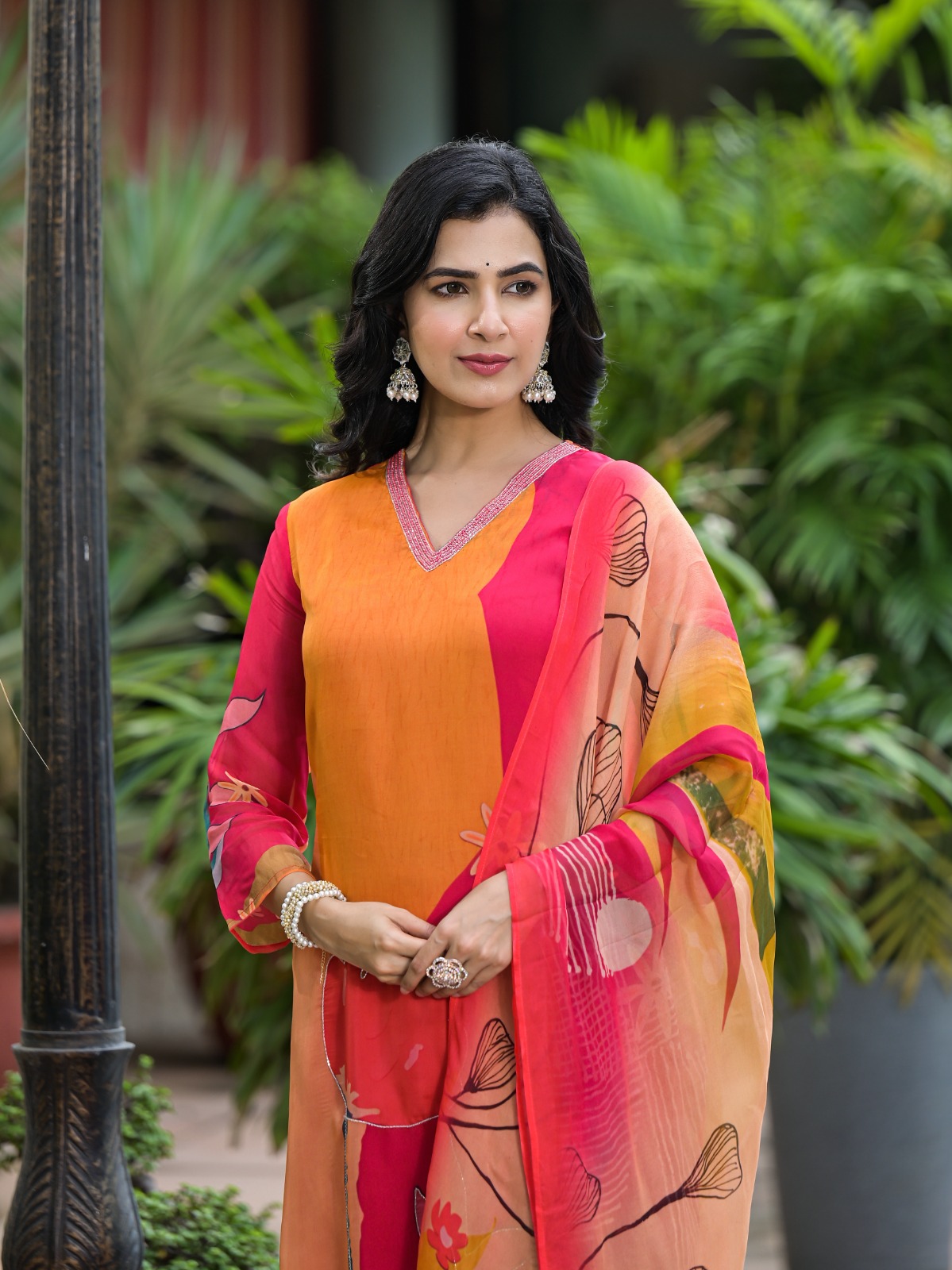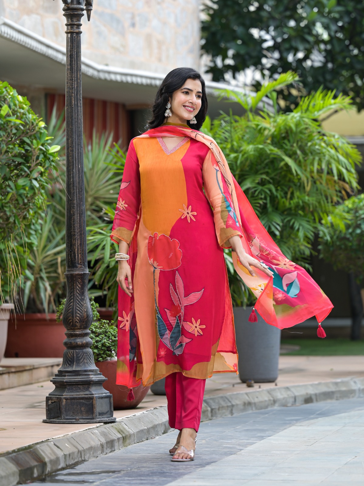Design: Bold floral prints with a breezy dupatta